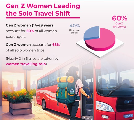 ● Gen Z women (14–29 years) make up 60% of all women passengers and account for 68% of solo women trips.